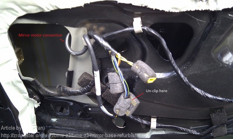 2: Undo the speaker wire and the wire shown in the picture, this will allow the mirror connection to be pulled through the door.