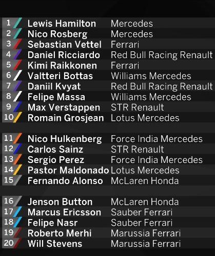 11) Nasr 12) Massa 13) Bottas 14) Maldonado 15) Merhi 16) Stevens