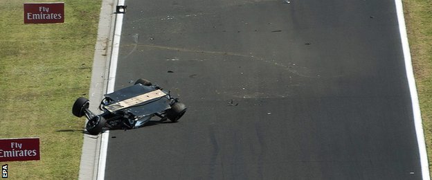 His car flipped and came to rest upside down after hitting the wall following a spin out of the Hungaroring's Turn 11, caused by a rear suspension failure.