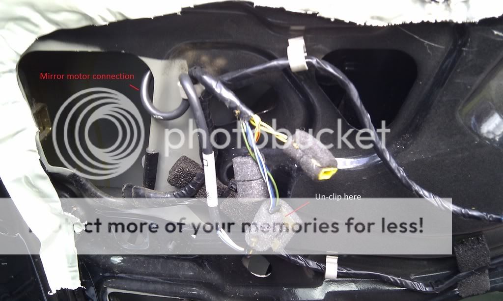 2: undo the speaker wire and the wire shown in the picture, this will allow the mirror connection to be pulled through the door.
