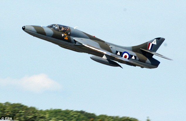 The jet 1955 Hawker Hunter, pictured here seconds before impact, was destroyed in the crash
